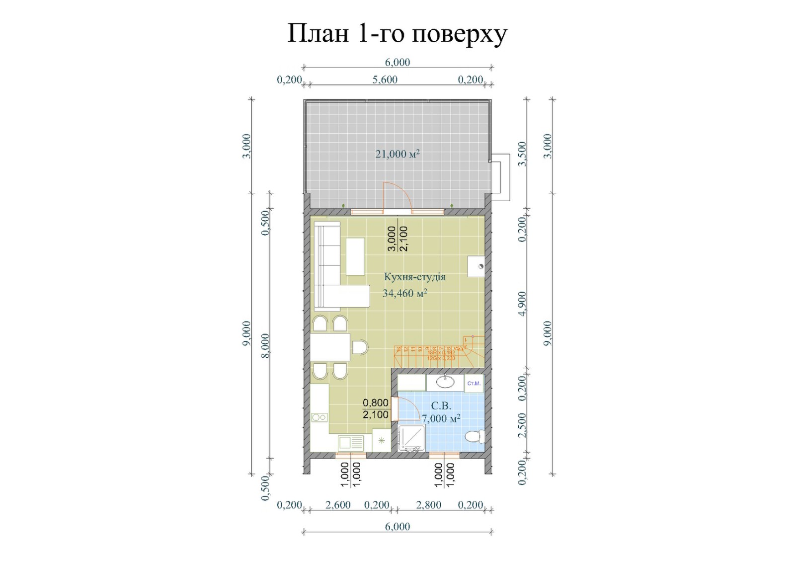 Step through the glass door into a spacious main room that seamlessly combines the kitchen, dining area, and relaxation zone into one harmonious space. The ground floor also features a well-equipped bathroom with a shower, toilet, and sink.