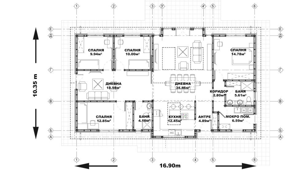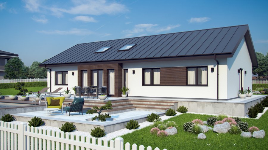 A beautifully thought-out project with attention to every detail 160m². Imagine: you approach a large and impressive house, designed with care for every element. This is a single-story structure built using wooden frame construction technology. It looks solid and spacious. In front of you stretches a terrace leading to a pool, where you can relax under the warm sun, feeling that every part of the house was designed for your comfort.
