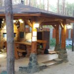 Inside, the gazebo features robust log furniture — a large, sturdy table and comfortable benches, perfect for gatherings and relaxation. In the corner, a brick fireplace with a built-in stove, made from fire-resistant materials, provides warmth and creates a welcoming centerpiece for cool evenings.